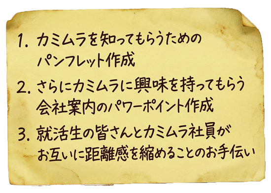 就活生の皆さんだけでなく、私たちもカミムラの一員として会社への理解を深めていければと思います。